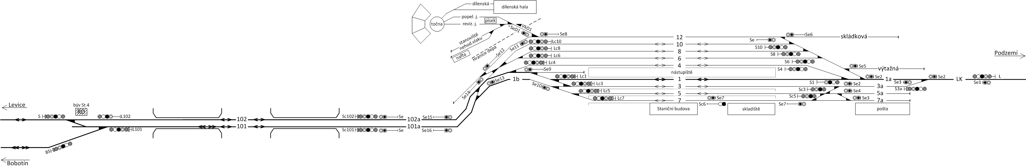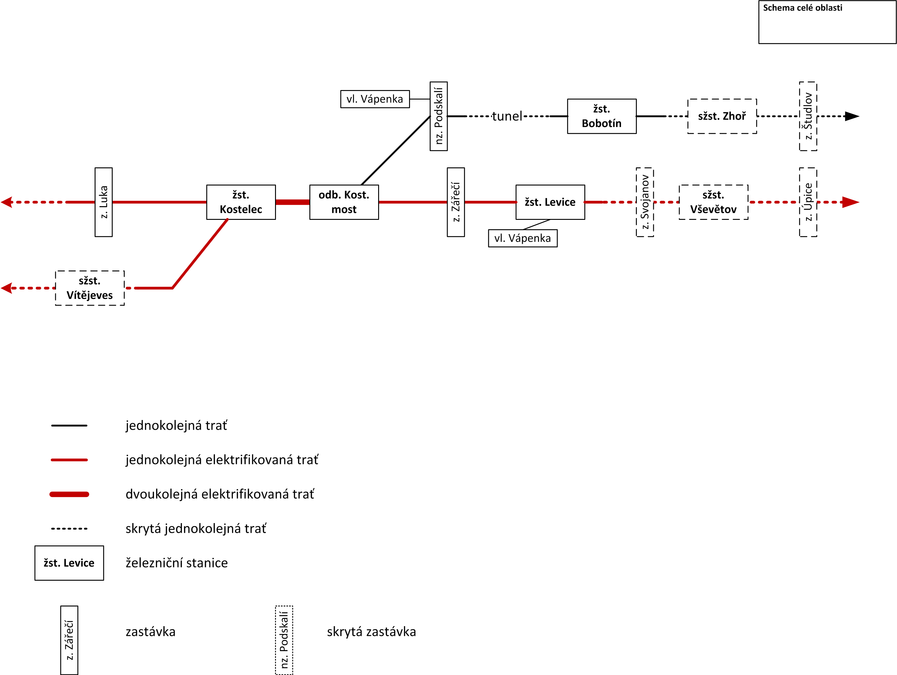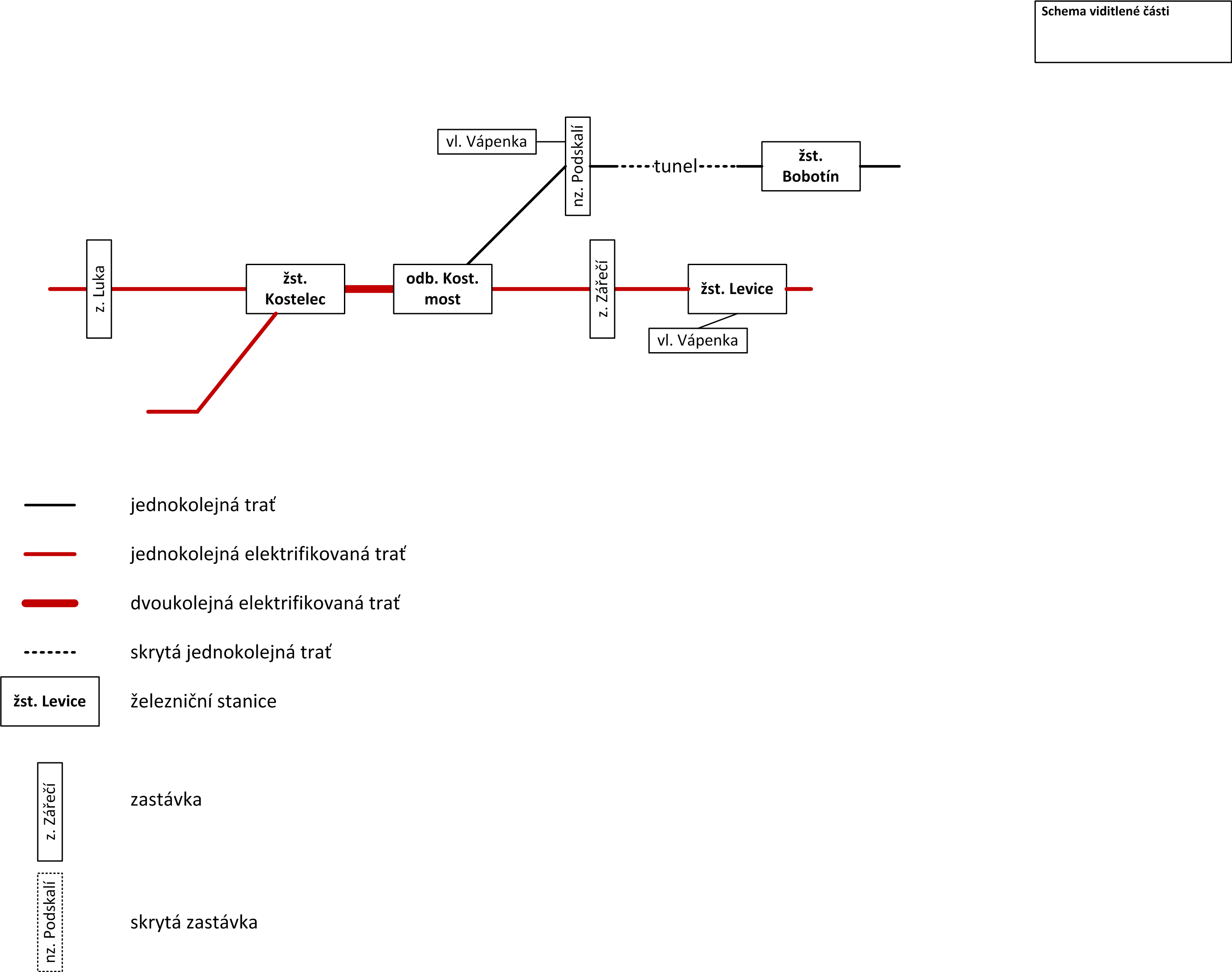 Schematický plánek mezistaničního úseku žst. Levice - žst. Bobotín, včetně nákladiště podskalí a vlečky Vápenka.