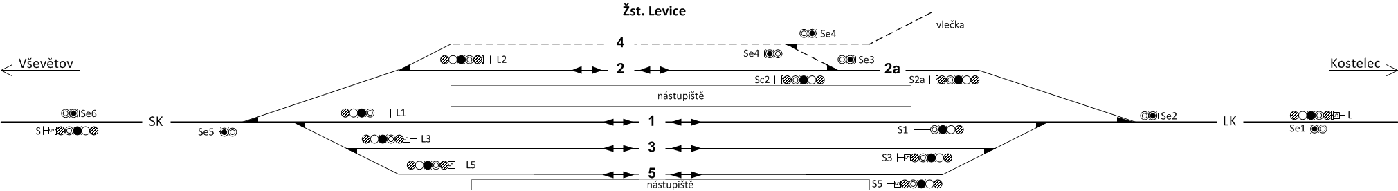 Levice je mnohem jednodušší stanice. Ostrovním nástupištěm a občas využívaným nástupištěm ustaniční budovy, návěstidly odpovídá stanicím podobného typu po modernizaci / koridorizaci.